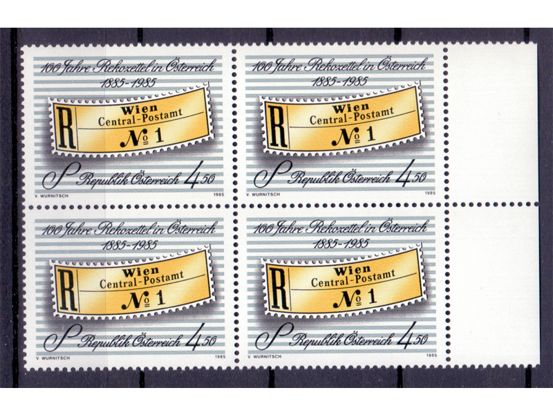 Österreich 1985 100 Jahre Rekozettel 4er Block / **
